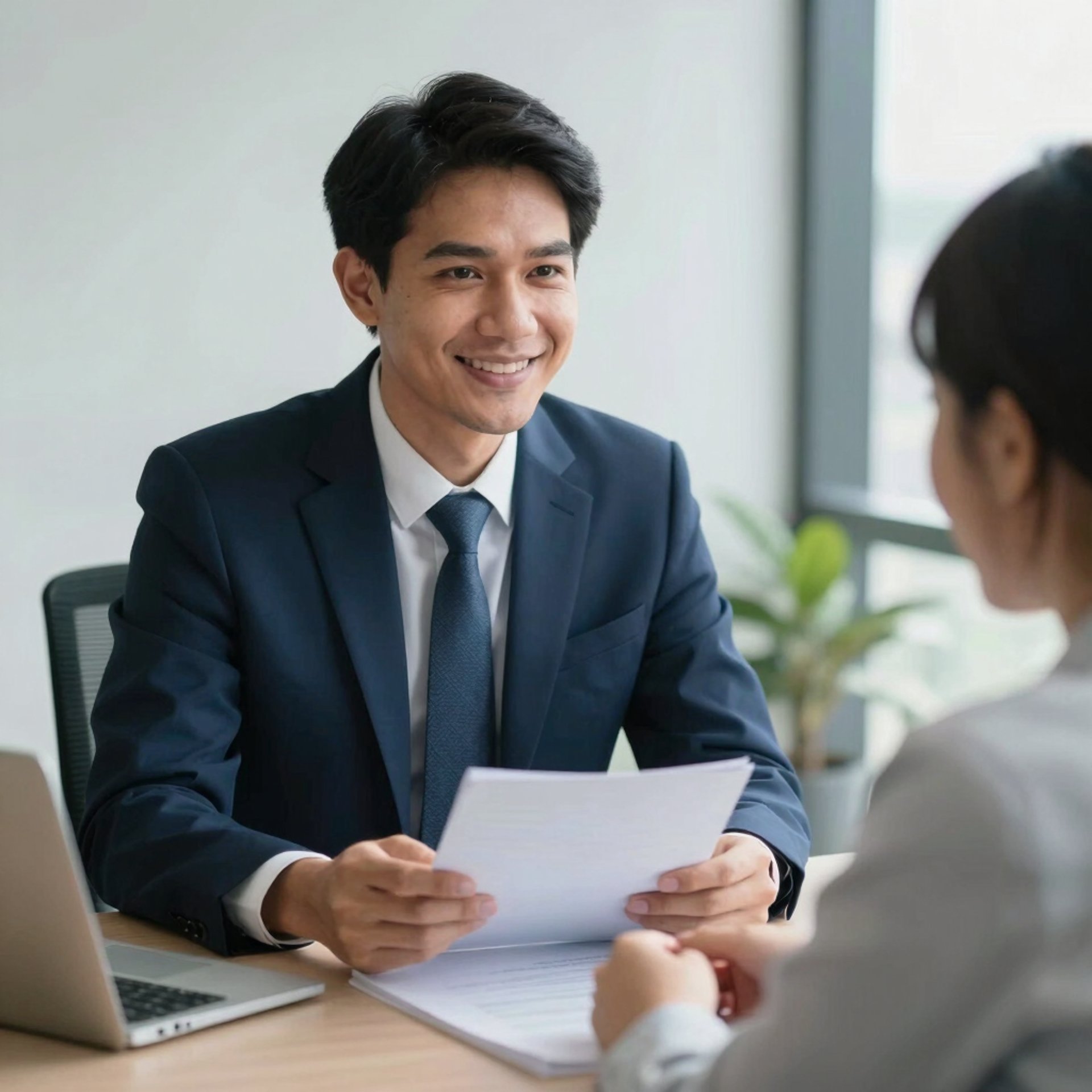 A professional insurance consultant in a modern Southeast Asian / Thai office, speaking with a young couple, soft morning light, White Mist and Muted Teal Blue office decor, sophisticated and clean.